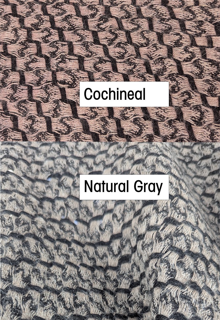 There are two varieties of this shawl: Gray, the natural color of the wool, and one that was over dyed with Cochineal, and is light pink.