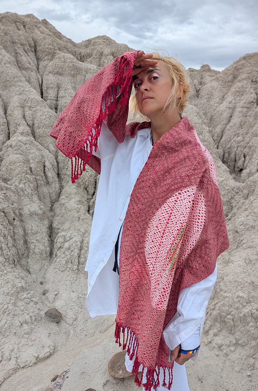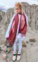 This scarf is made with a combination of many techniques: Ikat, woven shibori, and clamp shibori. The woven shibori in this scarf gives it have a wild psychedelic appearance. Beautiful drape, extremely fine, and as soft as they come.