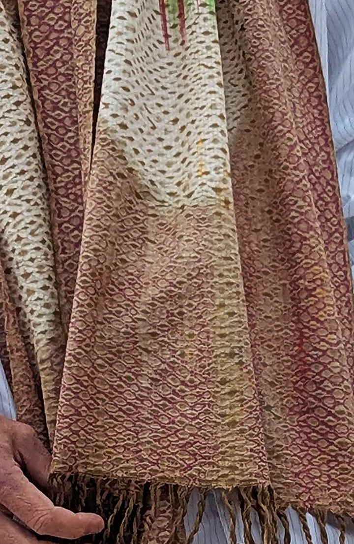 This scarf is made with a combination of many techniques: Ikat, woven shibori, and clamp shibori. The woven shibori in this scarf gives it have a wild psychedelic appearance. Beautiful drape, extremely fine, and as soft as they come.