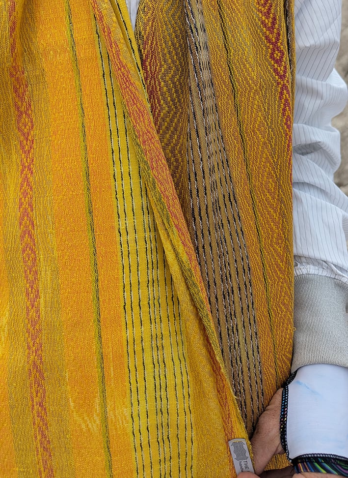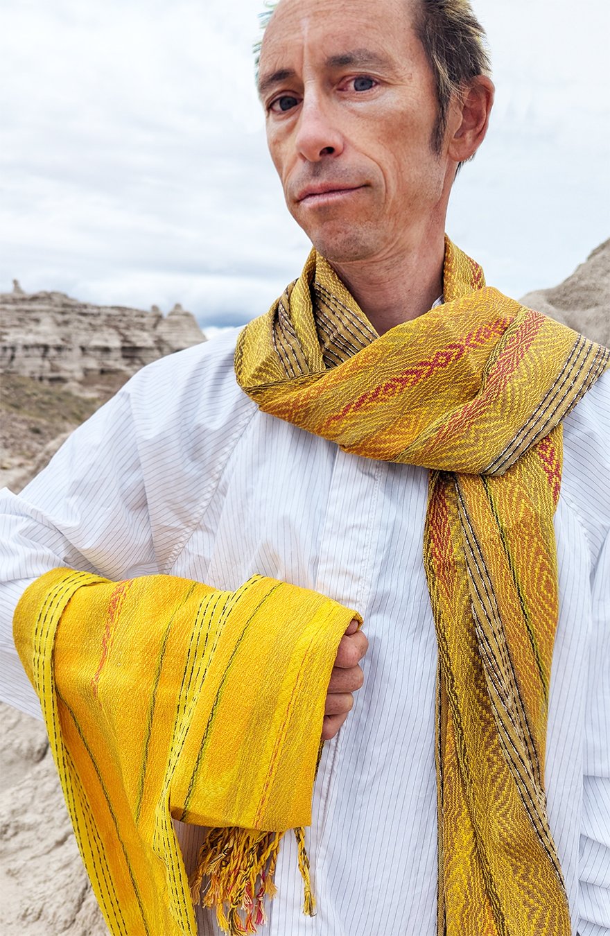 These luxurious scarves were created by Dain. Two stunning golden options, one bright yellow, the other antiqued gold. A turned overshot gives them a stunning pop. Great for dressing up anything, anytime!